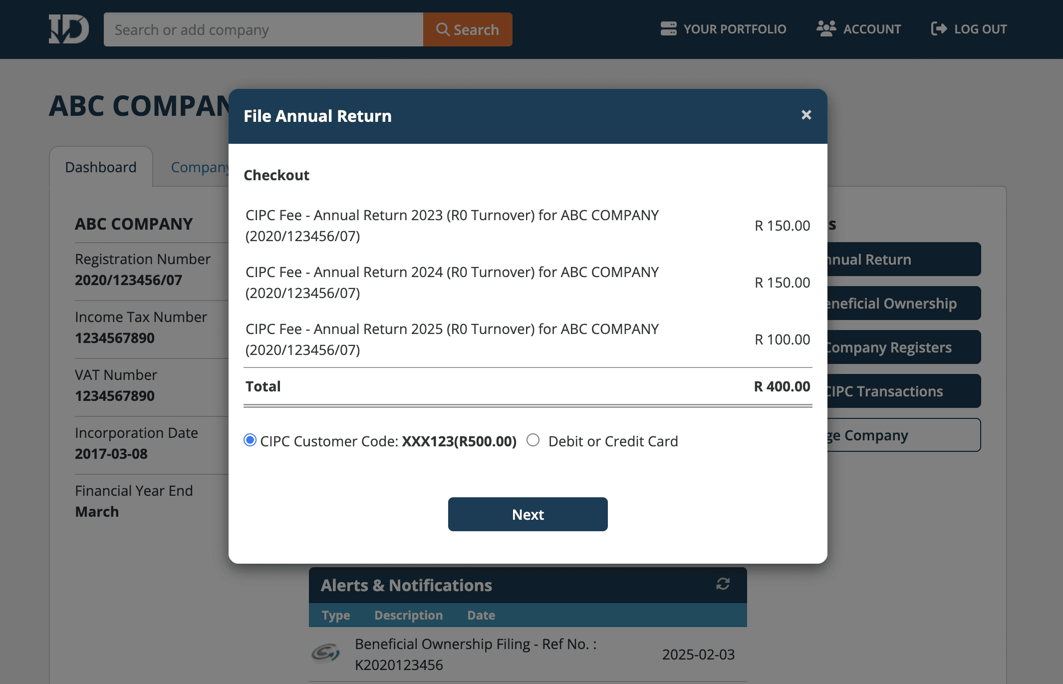 At checkout you can now choose how to pay: select your CIPC customer code (we’ll show its available balance and apply it when funds are sufficient), or pay via card.