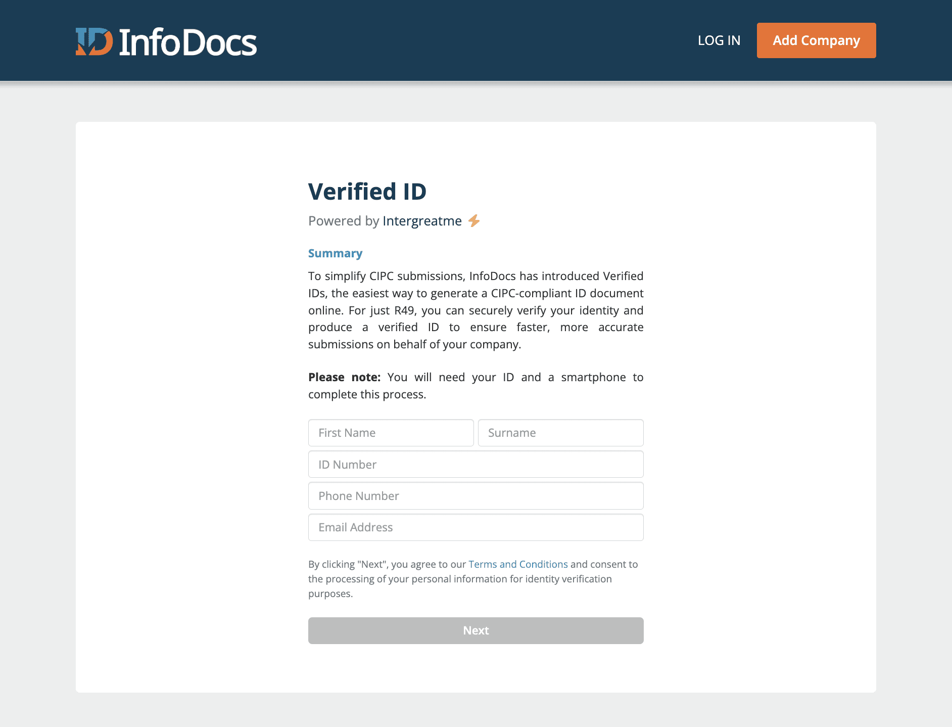 Some CIPC transactions require a certified (or verified) copy of your ID and getting one can be a hassle. We’ve partnered with Intergreatme to save you time and verify online.